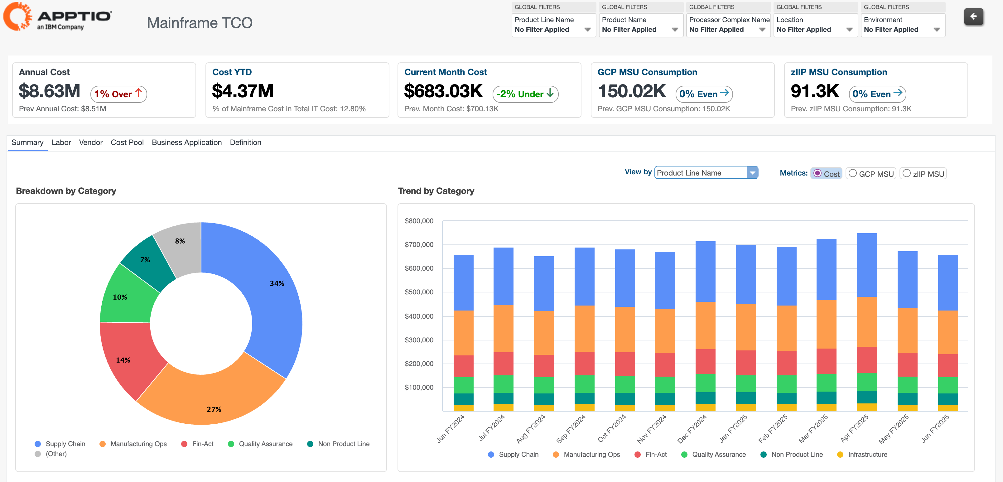 IBM Apptio’s Mainframe TCO solution helps you understand your total cost of ownership, accurate usage, & utilization of mainframe environments. It supports a variety of performance data sources, but when paired with IBM Z IntelliMagic Vision for z/OS performance management software, it unlocks deeper insights and a 360° view of mainframe economics. It surfaces detailed insights across total costs, consumption trends, and cost allocation, helping organizations manage mainframe spend and better inform modernization decisions.